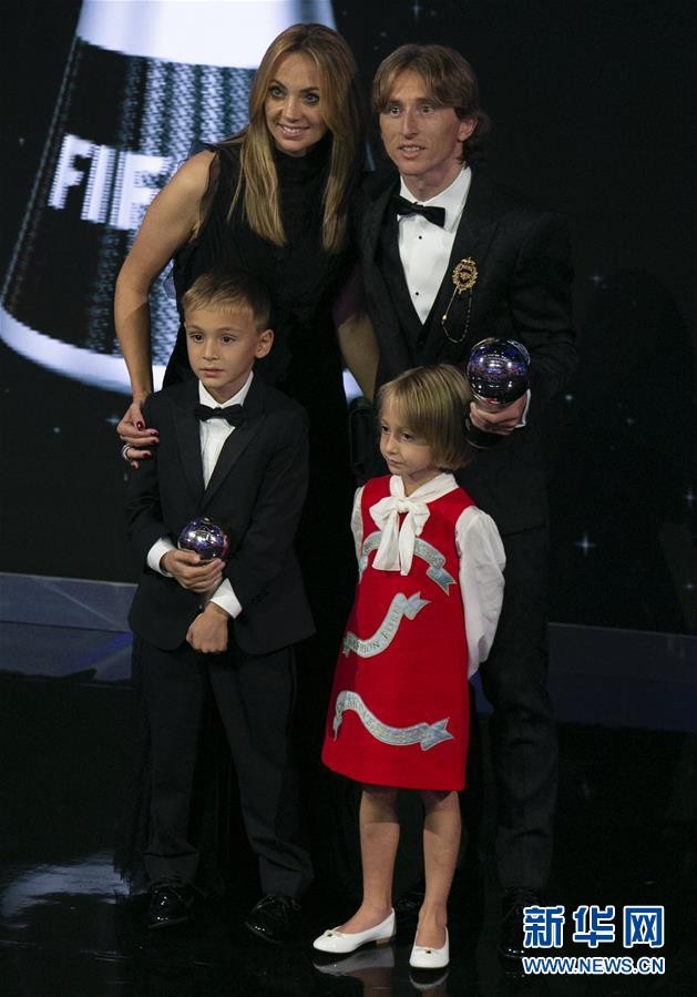 9月24日,克罗地亚球员莫德里奇在颁奖典礼后与家人合影。 新华社记者韩岩摄