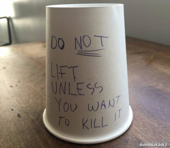 在他的桌子上放一个写着“别动,除非你想杀掉它”的纸杯。