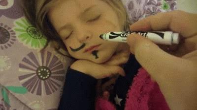 在他睡着的时候给他脸上画上胡子,然后欣赏他发现时的表情。