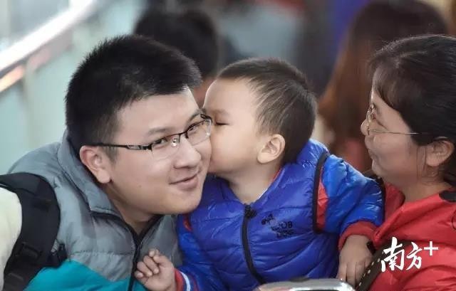 △满足--春运期间的火车站里,一位爸爸正接受着来自孩子的香吻。此刻,这位父亲的心中必定是充满了满足。