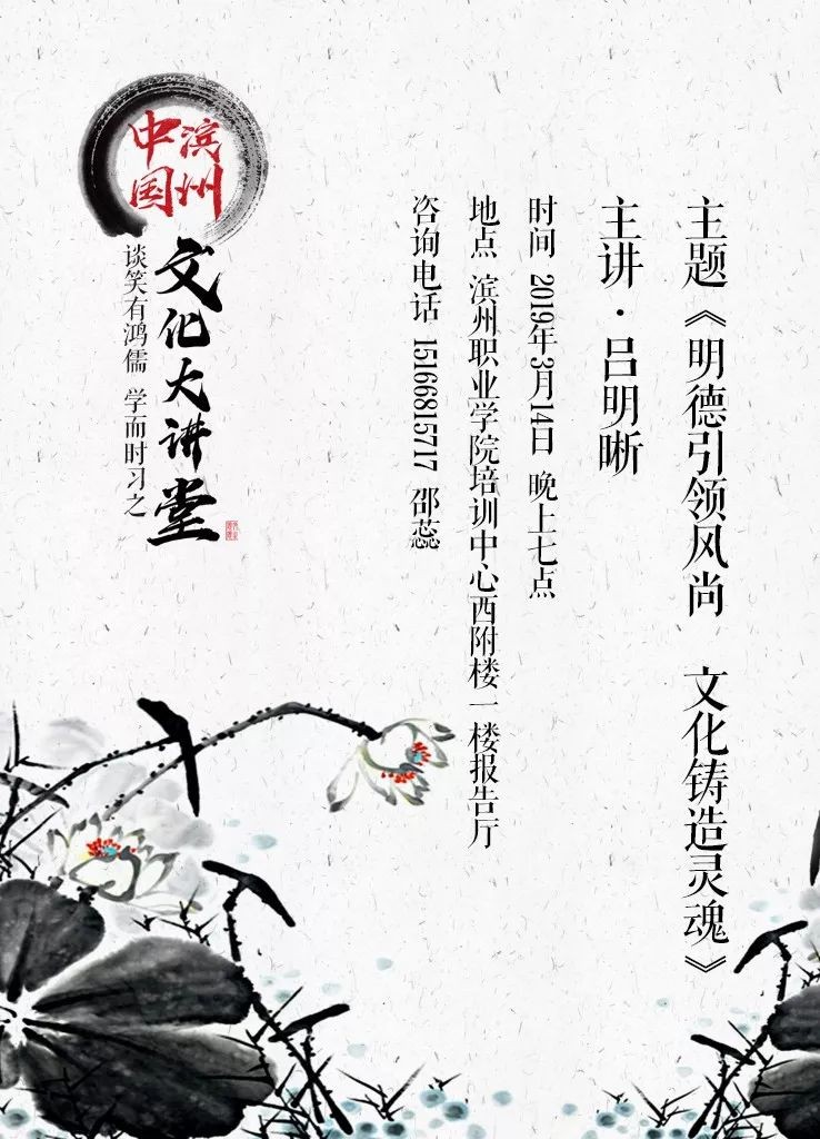 您都可以在吕明晰老师的《明德引领风尚 文化铸造灵魂》文化讲堂中得到答案,并能够体会中华优秀传统文化传承发展的精髓。3月14日,滨州文化大讲堂,与您相约滨州职业学院!
