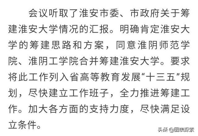 2014年机会终于来了,2014年9月27日,淮安大学筹建工作领导小组第1次会议,在淮阴师范学院召开。这次会议上宣布江苏省教育厅厅长沈健,淮安市人民政府市长曲福田担任淮安大学筹建工作领导小组组长。