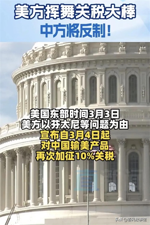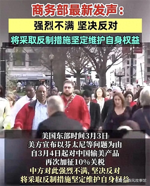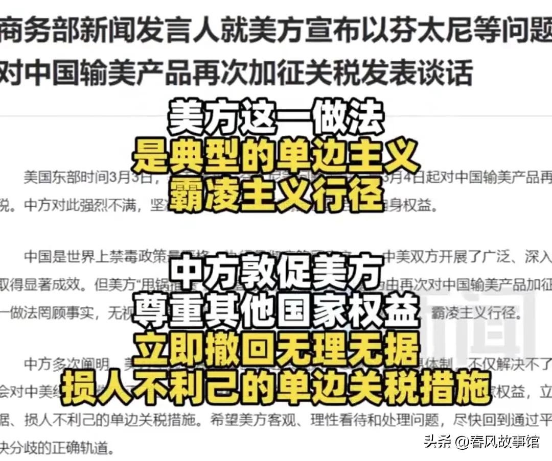 回顾中美经贸关系的历史,2018 年特朗普政府不顾中方劝阻,执意发动贸易战,掀起了一轮波及面广、影响空前的中美贸易争端。这场争端在 2019 年达到白热化,对美国自身也造成了不小的损害。如今,美方再次以芬太尼为由加征关税,这种行为不仅无助于解决自身问题,反而会进一步加剧中美经贸关系的紧张局势。在当前全球经济形势下,中美两国作为世界上最大的两个经济体,经贸关系的稳定发展对于全球经济的复苏和增长至关重要。希望美方能够摒弃单边主义和霸凌主义思维,与中方相向而行,共同推动中美经贸关系健康稳定发展。