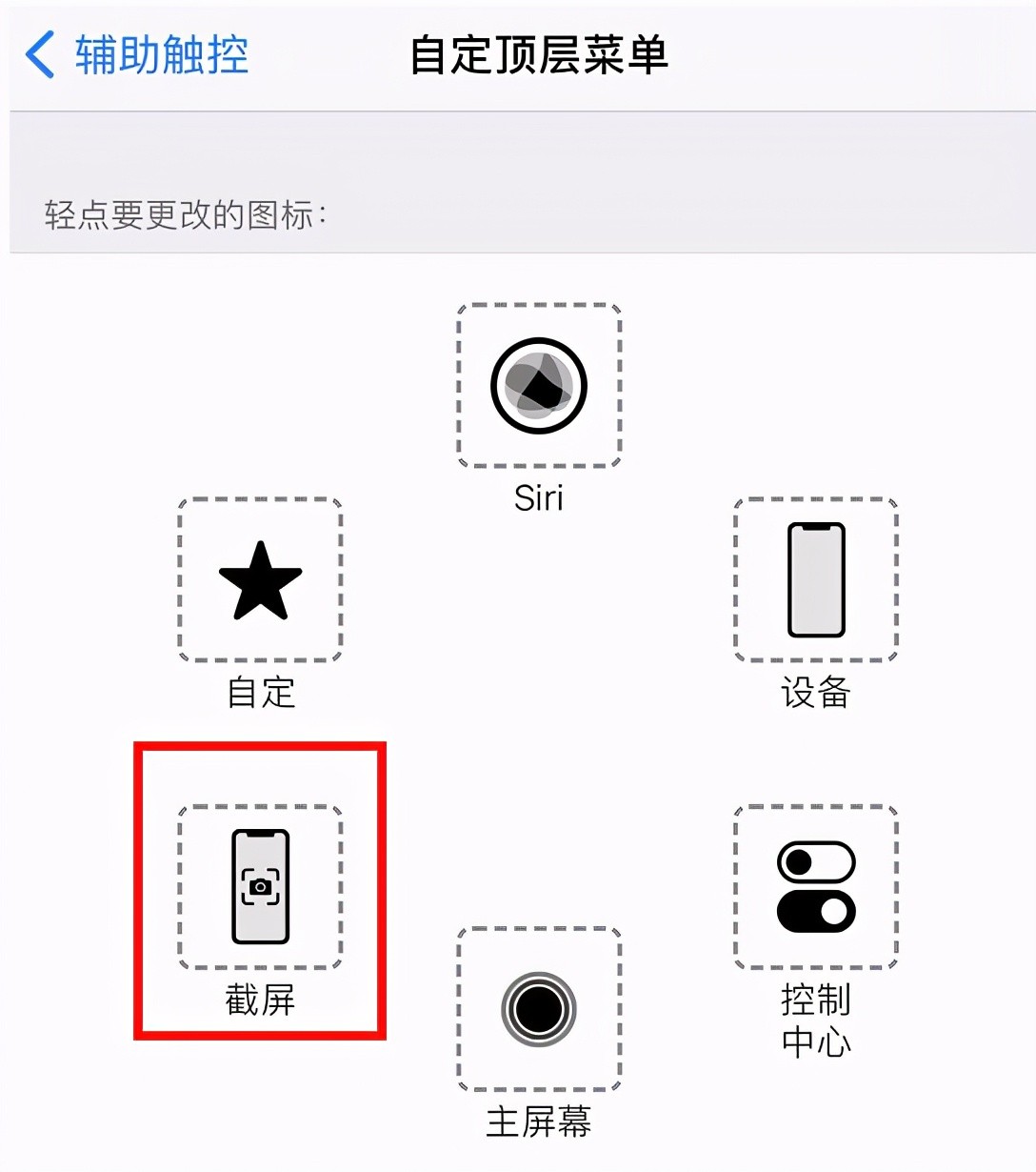 6、选择“自定顶层菜单”中任意图标,将其修改成截屏,即可完成设置。
