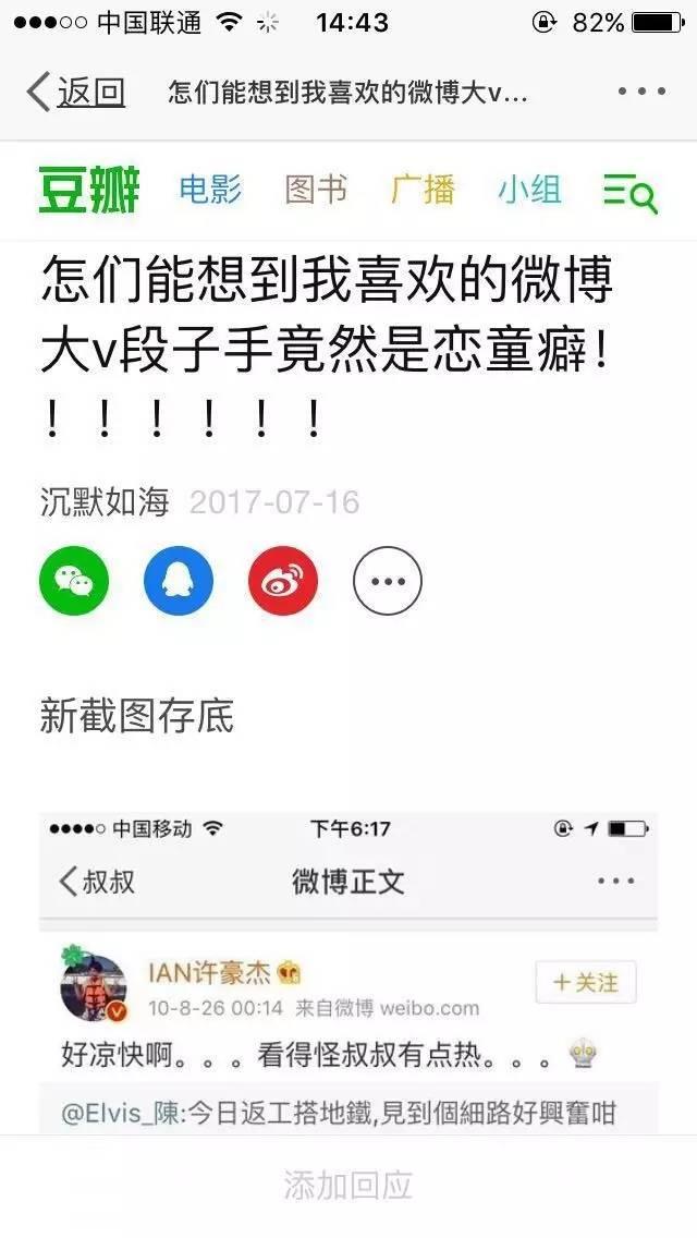 7月16号,豆瓣网友@沉默如海在豆瓣发表长文“怎们能想到我喜欢的微博大V段子手竟然是恋童癖!!!!!!!”指出创业之神许豪杰疑似有恋童癖,并涉嫌买卖儿童色情视频和儿童性交易行为。