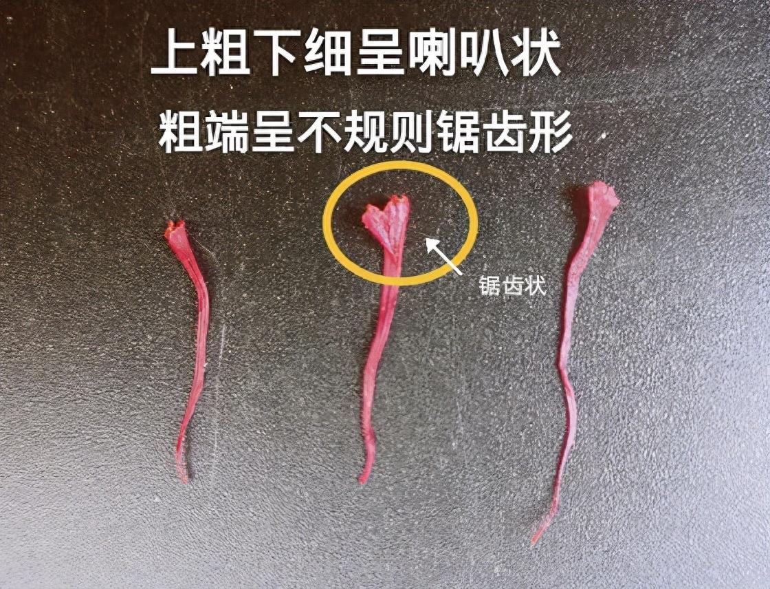 真的藏红花,一端粗一端细,粗的一端成不规则的锯齿状。我们可以想想要把玉米须做成如此自然微妙的形状,还真有点难度,估计成本都高于藏红花的卖价了,有必要作假吗?