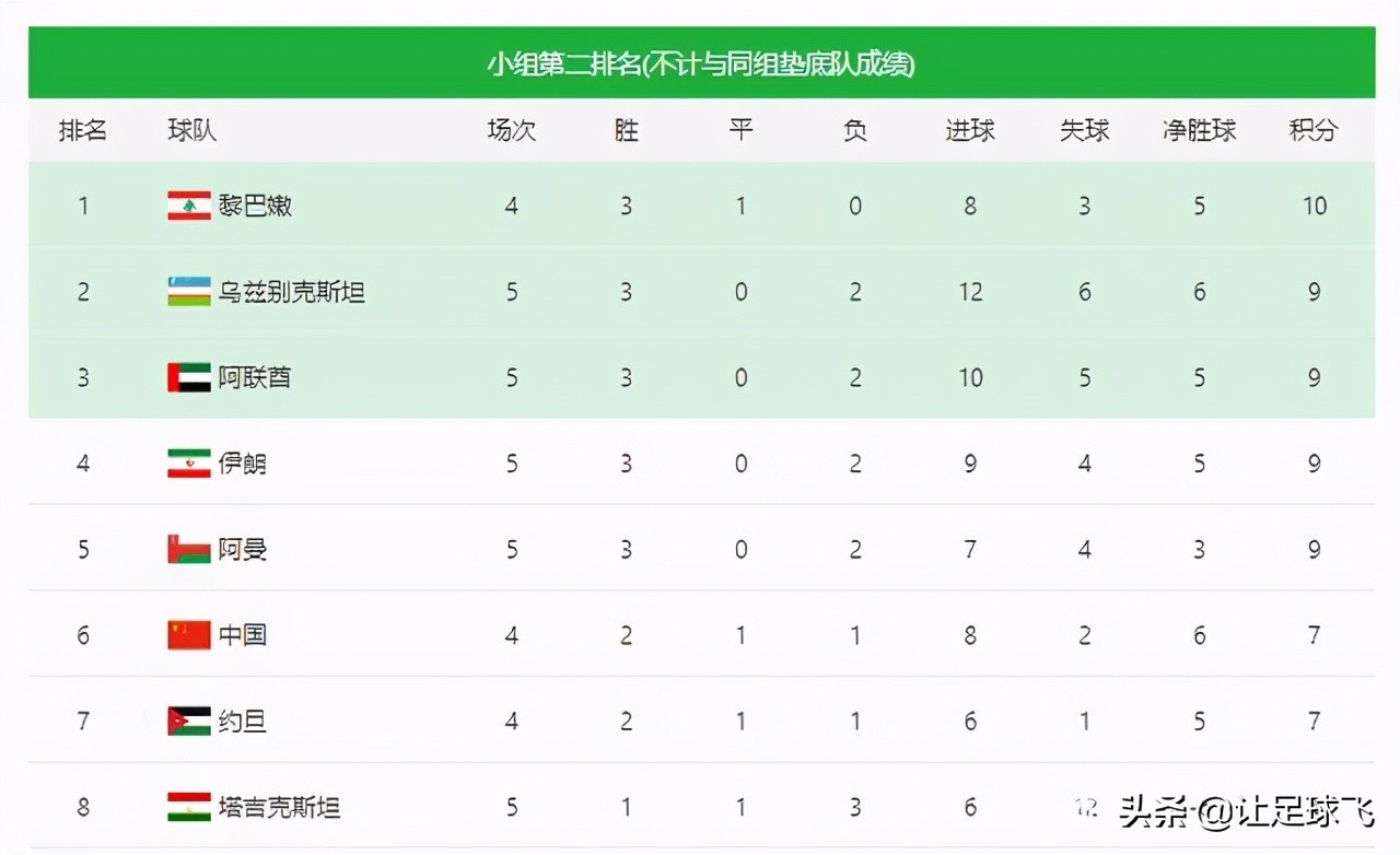 从目前各组小组第二的成绩排名来看,国足虽然暂列第6名,处于5个成绩最好的小组第二的晋级资格线以外,但考虑到排名2~5名的乌兹别克斯坦、阿联酋、伊朗、阿曼几队大多都是除了对阵垫底球队以外只有一场有效比赛,且不少是跟榜首球队硬碰硬的较量,即便能够获胜得到的最大分数也只有3分;反观国足与马尔代夫叙利亚的比赛都是有效比赛,如果都能够获胜,那么球队将会有6个积分可以争取。那样届时球队将肯定能够冲进小组第二晋级区,甚至巧合足够的话都有成为最好小组第二的可能。