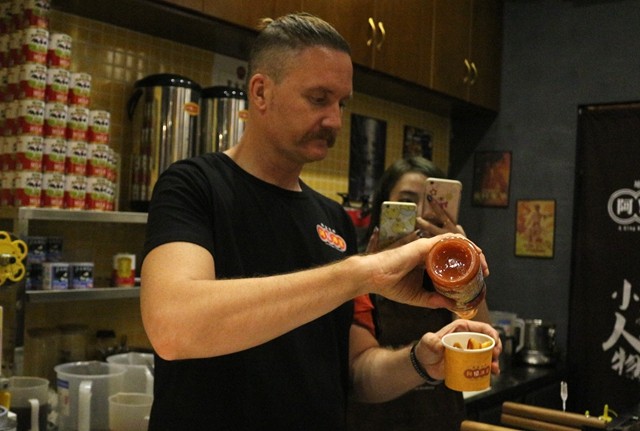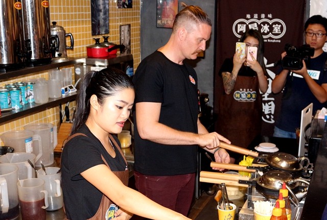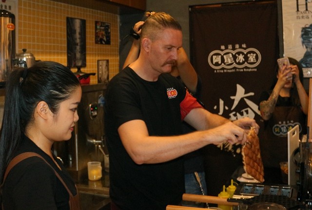 布伟杰还在现场亲自制作港式小点心给现场的消费者免费品尝,老外做起美食小吃也是很拿手哦。