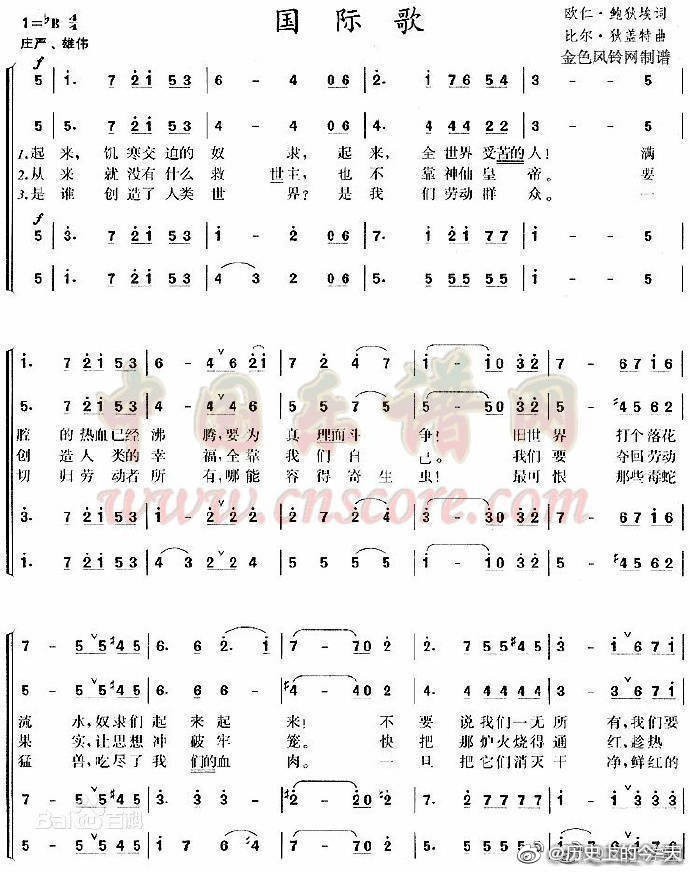 《国际歌》:是谁创造了人类世界?是我们劳动群众。一切归劳动者所有,哪能容得寄生虫!最可恨那些毒蛇猛兽,吃尽了我们的血肉。一旦把他们消灭干净,鲜红的太阳照遍全球!这是最后的斗争,团结起来到明天,英特纳雄耐尔就一定要实现。这是最后的斗争,团结起来到明天,英特纳雄耐尔就一定要实现!