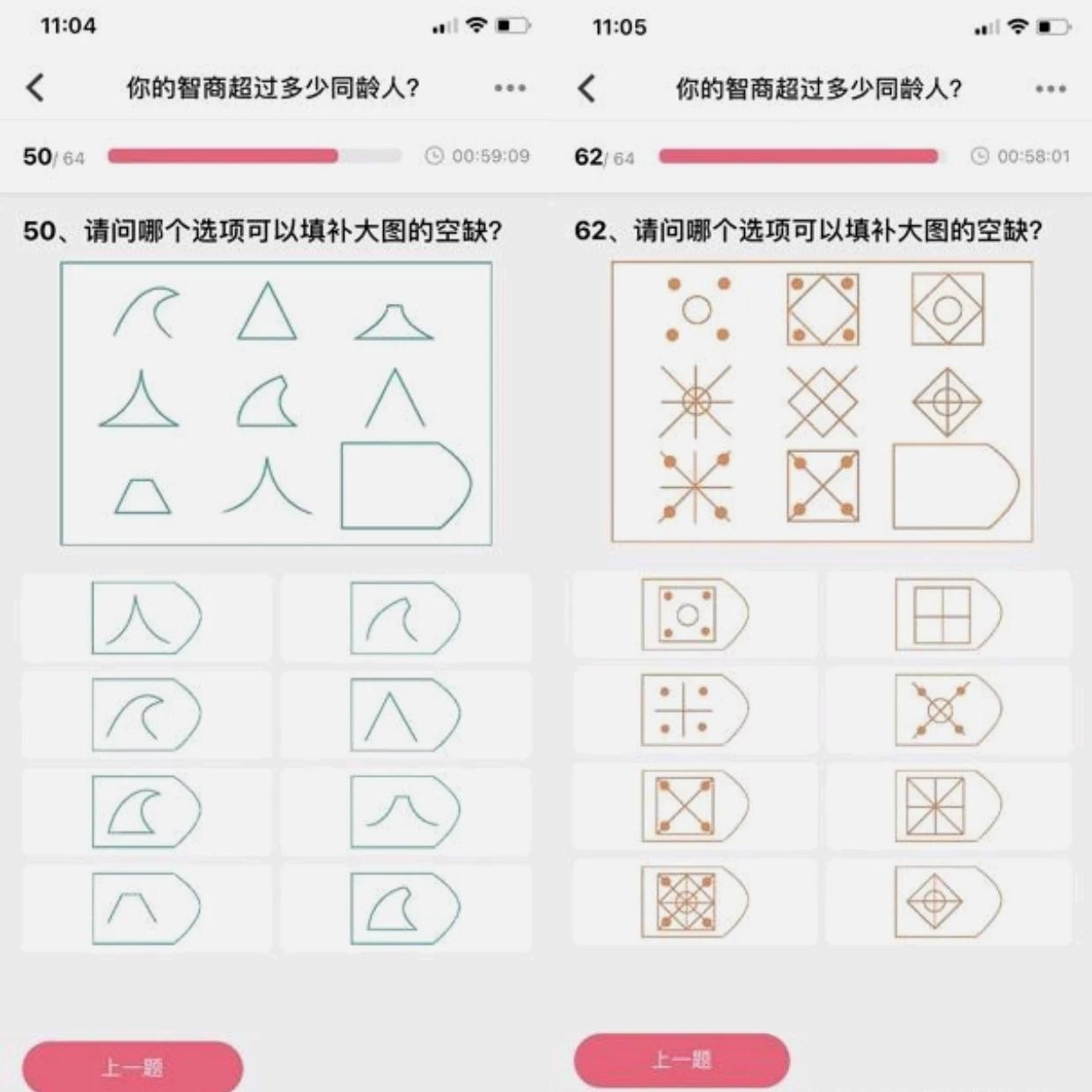以我的理解,能测量智商的测试题,你能做出来,瞬间就能做出来,你做不出来,你可能永远做不出来。比如第50题和第62题,我做二次都没有做出来过。