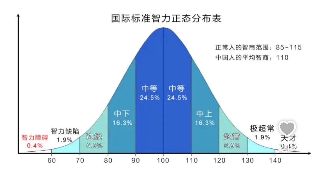 我自己也做过两次智商测试,得分都在108左右,差别不大。因此,我认为国际标准的智商测试题还是相当准确的。此外,我们还可以通过查看国际标准智商测试的正态分布图来了解自己的智商水平。这个图表可以告诉我们在整个人群中的相对位置,帮助我们对自己的智商水平有更清晰的认识。