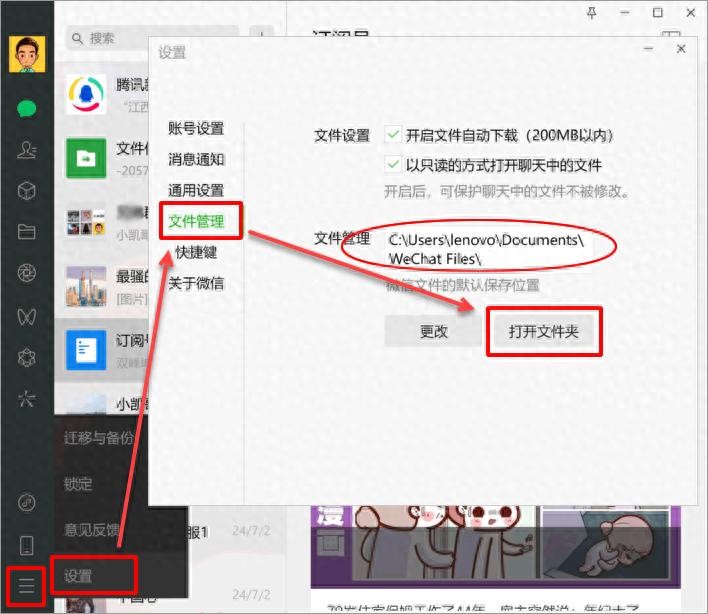 1,进入电脑版微信设置窗口中的文件管理,可在右边看到电脑版微信聊天记录保存的路径,点击下方的“打开文件夹”按钮,可以快速进入该目录。