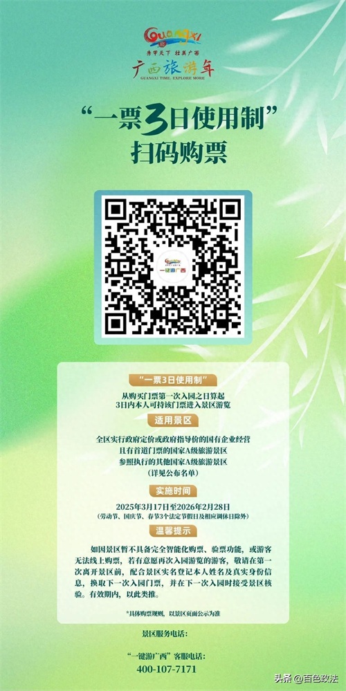 3月17日,自治区文化和旅游厅公布广西国家A级旅游景区“一票3日使用制”景区名单以及操作指引,实施时间为即日起至2026年2月28日。该名单涵盖全区127个景区,游客从第一次入园之日算起,3日内可持该门票再次进入景区游览,体验深度游的魅力。不过,政策在节假日适用等方面,仍有部分事项需要注意。