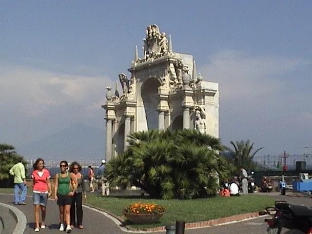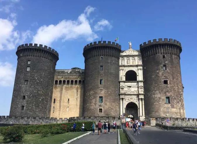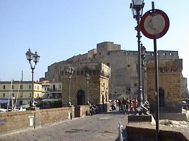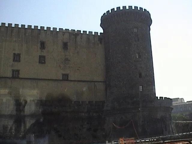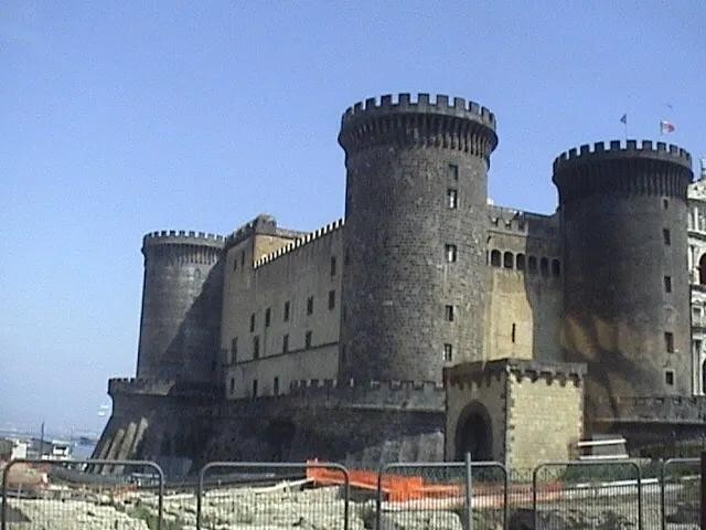 在离那不勒斯港不远的地方,坐落着一座高大宏伟的古堡,这就是新堡。新堡是安茹王朝在1279年兴建的,中间的白色凯旋门是 阿拉贡 王朝的阿方索一世为庆祝自己胜利而建的,现在是城堡的入口。这座文艺复兴早期的建筑,由五座圆柱形巨塔围成梯形空间。