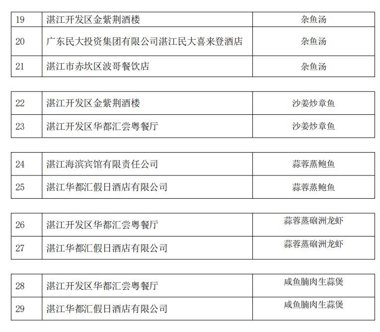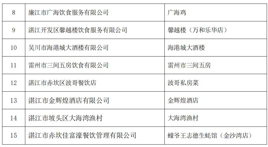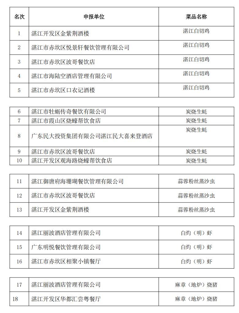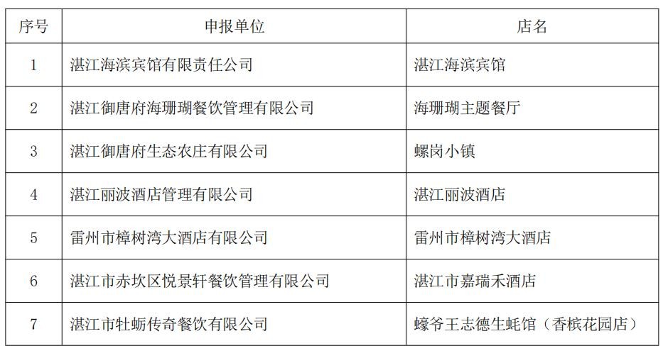 湛江丽波酒店管理有限公司、雷州市三间五房饮食有限公司、湛江市赤坎区波哥餐饮店等3家入选单位曾获评“2021年湛江市餐饮名店”称号,湛江市金辉煌酒店有限公司、湛江市坡头区大海湾渔村、湛江市赤坎佳富濠餐饮管理有限公司等3家入选单位曾获评“2022年湛江市餐饮名店”称号,本次拟授予“湛江餐饮名店(二星)”称号。其余9家入选单位拟授予“2024年湛江餐饮名店”称号。