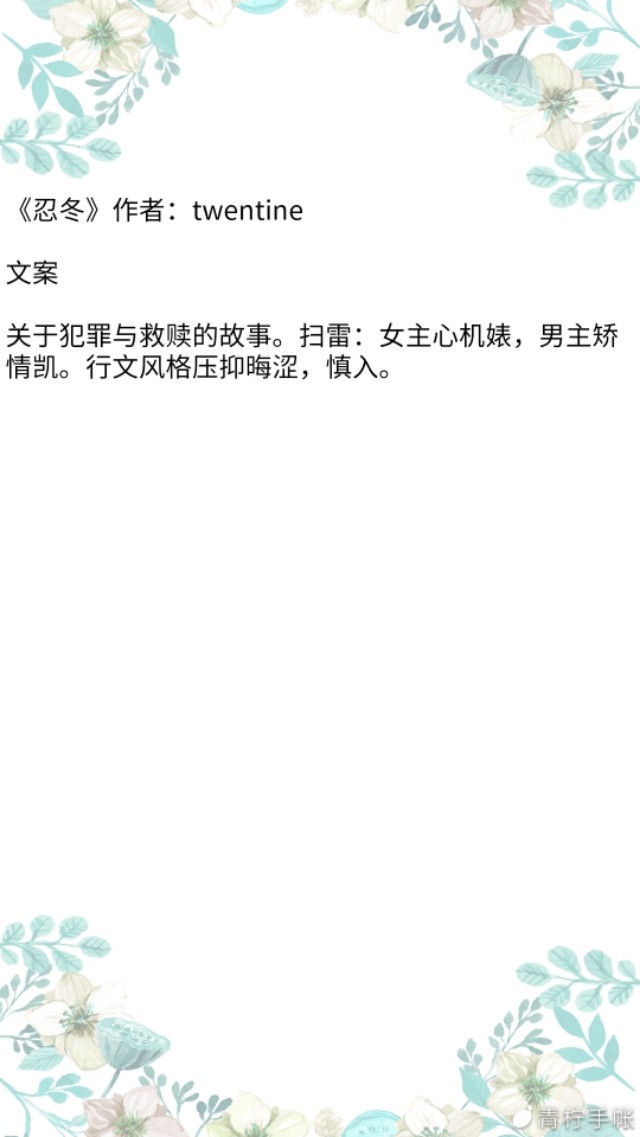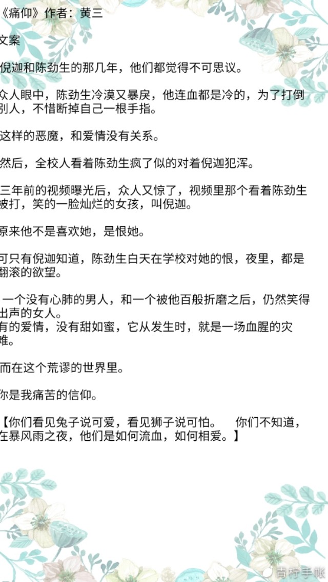 简评:女主因为一个目的接近男主,而男主也因为自己家庭原因想要放弃。总之,这篇文他们两个人是互相救赎的,两个人的性格都有缺陷,但是作者大大的文笔很好哦。