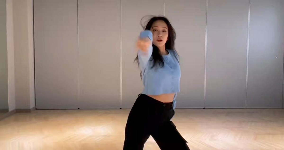 视频中的刘美含身穿浅蓝色短款上衣搭配高腰运动裤,大秀优美的舞姿,又甜又飒!