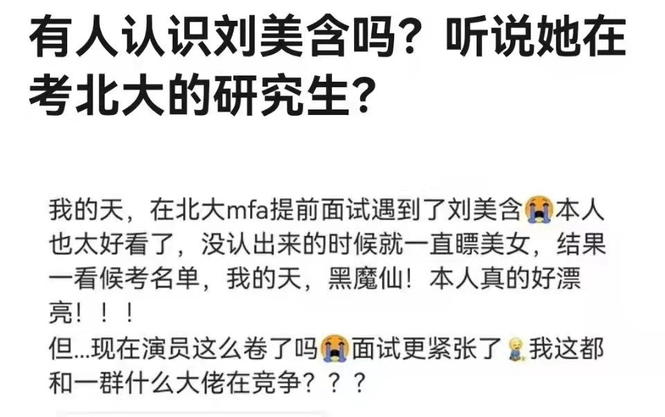 而在近日,有网友在北京大学的一场面试中便遇到了刘美含。据悉,此前有消息称她正在备考北京大学的研究生,并且取得了面试第五的好成绩,祝福她!