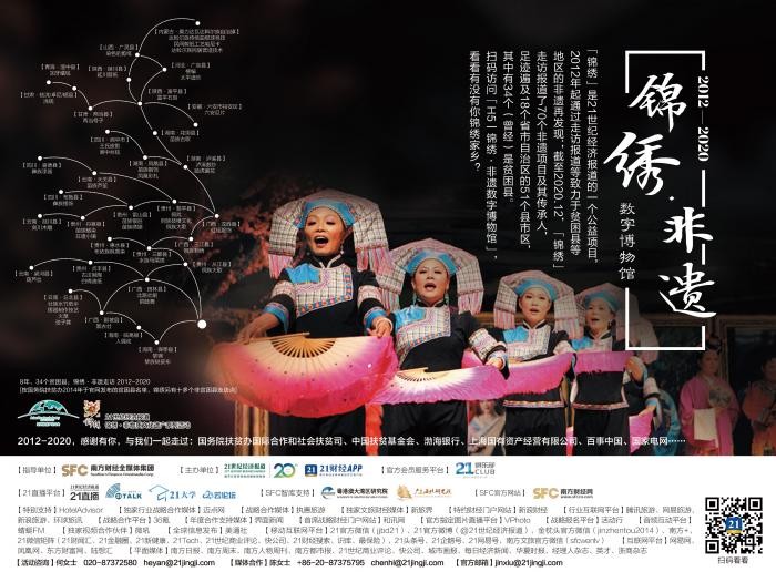 「锦绣」是21世纪经济报道的一个公益项目,2012年起通过走访报道等致力于贫困县等地区的非遗再发现;从2012年到2020年12月,「锦绣」走访了70个非遗项目、传承人,足迹遍及18个省市自治区的51个县市区,其中(曾经的)贫困县达34个。