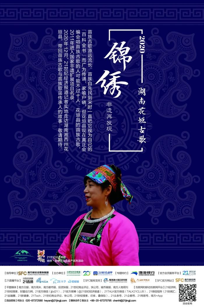2020年12月,21世纪经济报道记者专程从广州出发赴湖南省湘西州花垣县,走访湘西州州级苗族歌谣传承人石升美、以及花垣县苗歌协会等当地机构,带回苗族古歌在花垣县的传承故事。走访报道即将于21世纪经济报道锦绣版刊出,并于21财经App等融媒体平台发布。这也是「渤海银行特约·2020锦绣非遗发现之旅」的最后一站。敬请期待。