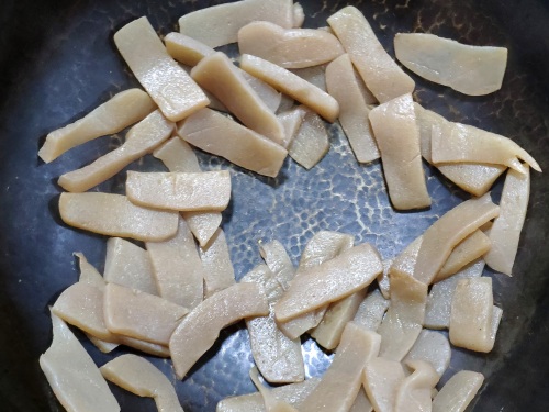 一,切好的魔芋豆腐放锅里先炒干水分。如果买到的魔芋豆腐不好,炒出的水分越多
