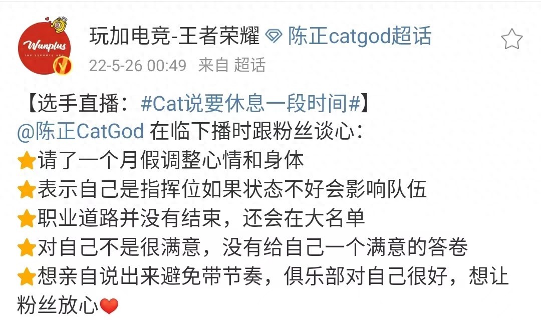 在过生日的时候,cat发出了很多感慨,他表示自己最近的状态和情绪都不太好。作为队伍的主指挥位,他也明白这样是很耽误其他队友的。所以他也需要好好调整一下,就和俱乐部提出了想回家休息一个月,在这期间也会正常直播,和粉丝们聊天互动。另外他也表示自己六年的青春都献给了王者荣耀,在人际交往方面有点与社会脱节了,也想趁着这个机会好好接触一下外面的世界。