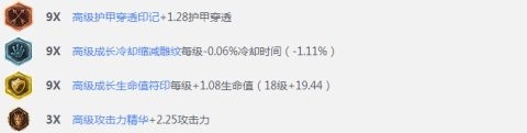 频繁的AD技能伤害,比起攻击,韦鲁斯前期更加需要一些破甲来增加输出,一定冷却缩减能够让你前期技能消耗更加频繁,成长生命值保障你中后期的生存,精华携带攻击符文增强你前期的战斗力。