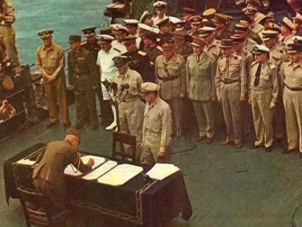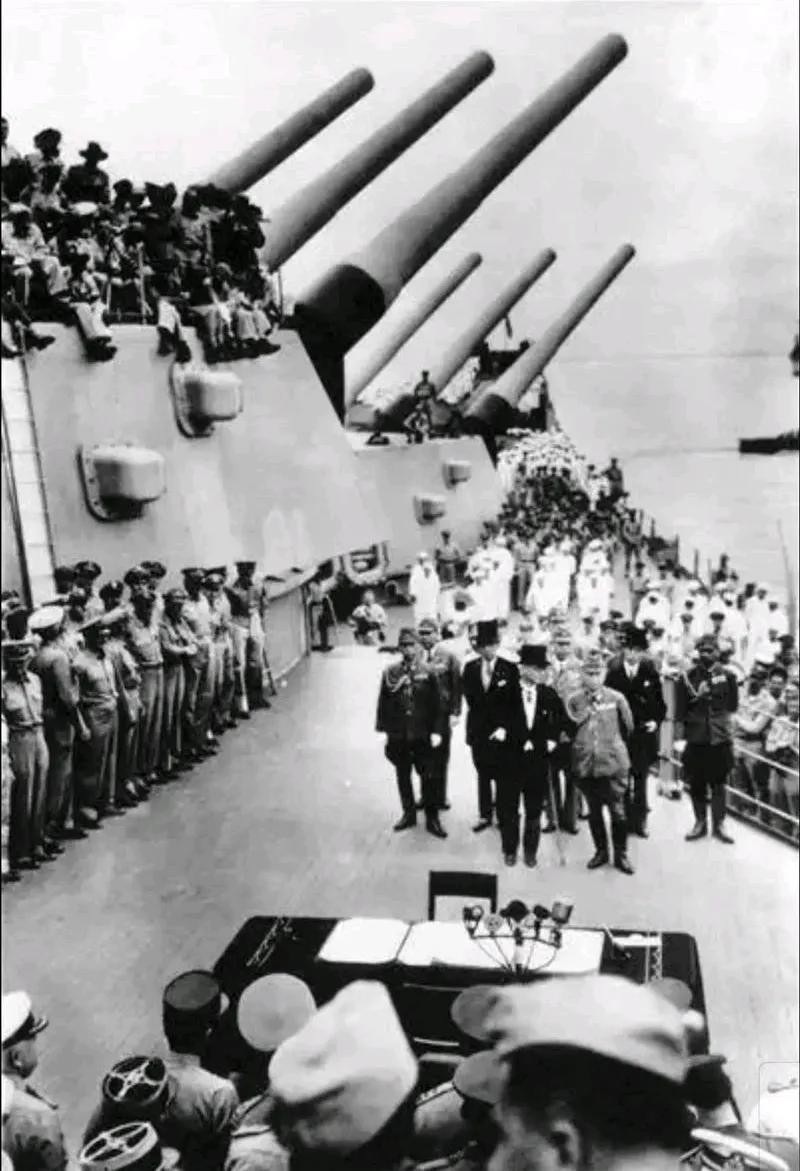1945年9月2日,日本无条件投降签字仪式在东京湾的“密苏里号”战舰上举行。这艘战舰是美国海军的旗舰,象征着美国在战争中的胜利。选择在此地举行仪式,具有强烈的象征意义,代表着日本在美国强大军事实力面前的屈服。