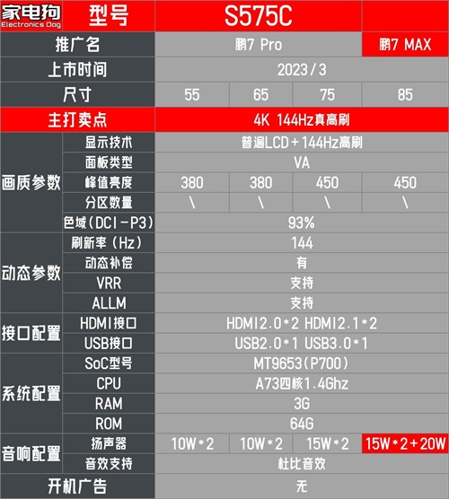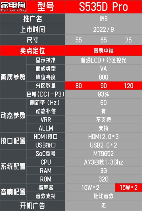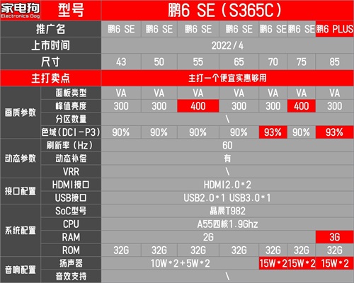 狗哥点评:仅看画质参数的话,对比S365算是“Pro”了个寂寞,也就是加入了120Hz的软高刷(4K分辨率下最高60Hz,所以我备注的60),色域提升了3%,对于画质提升来说,谈不上翻天覆地吧,也可以说是聊胜于无。