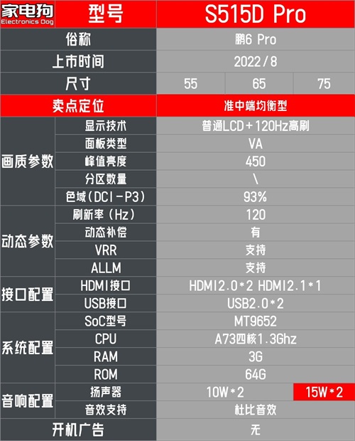狗哥点评:如果你想选一台准中端级别的水桶机型,那么S515D Pro会很合适——峰值亮度对比入门级强一些,也加上了真正的高刷,让它能适配更多的场景,你可以拿它来干很多事情,而且它都能让你满意。