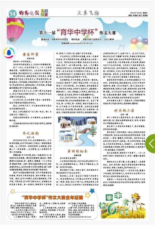 1月3日,《邯郸晚报》刊发了我校学子王一凡的《冬之温韵》,指导老师是我区语文名师杨敏老师。