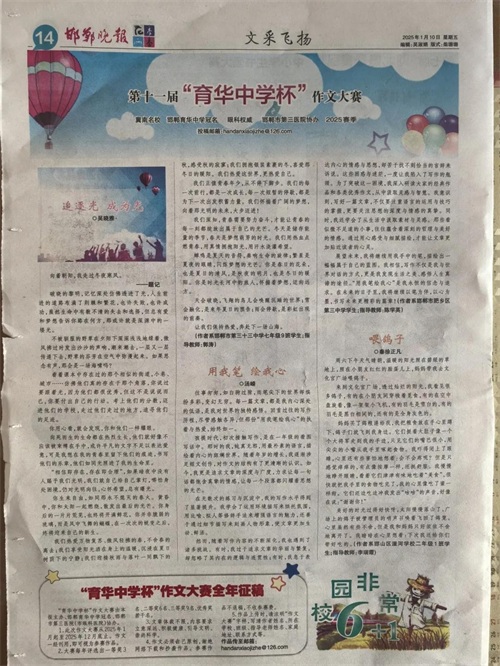 1月10日,《邯郸晚报》刊发了我校学子汤嵘佳作《用我笔 绘我心》文章,指导老师是我校深耕初三语文教学的陈学英老师。