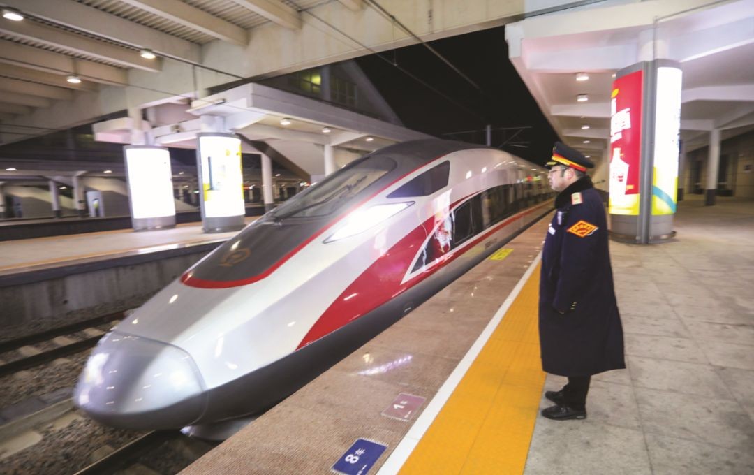 1月15日晚,“复兴号”动车组列车首次驶进高铁威海站。