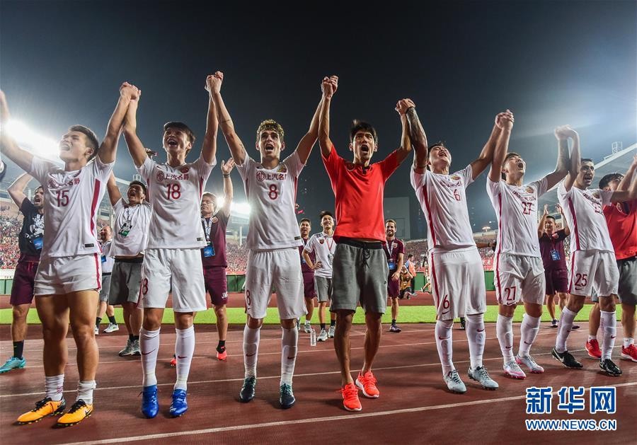 ↑9月12日,上海上港队庆祝胜利。当日,在2017赛季亚冠联赛四分之一决赛次回合比赛中,广州恒大淘宝队主场以4比0战胜上海上港队。双方两回合战成4比4,在加时赛中又以1比1战平。在随后进行的点球大战中,上海上港队以5比4战胜广州恒大淘宝队,晋级四强。新华社记者刘大伟摄