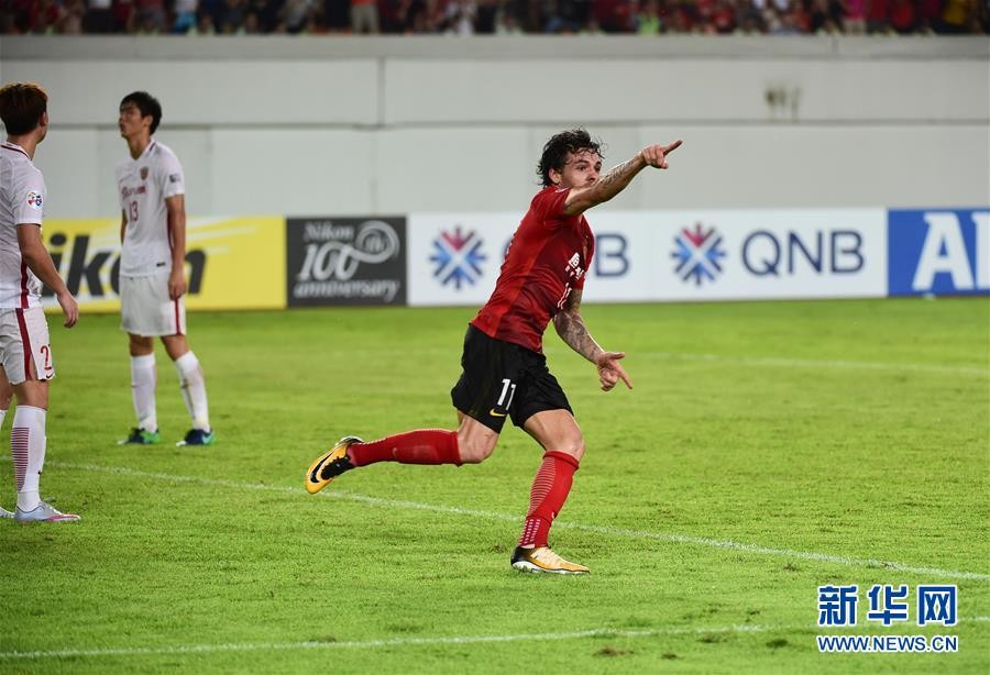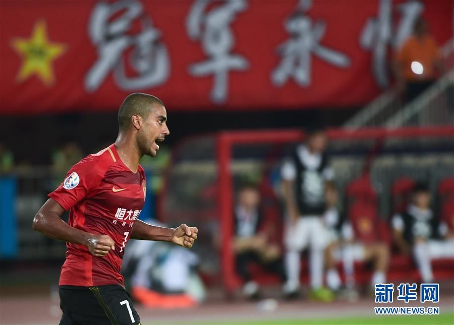 ↑9月12日,广州恒大淘宝队球员阿兰攻入第二粒进球后庆祝。 新华社记者刘大伟摄