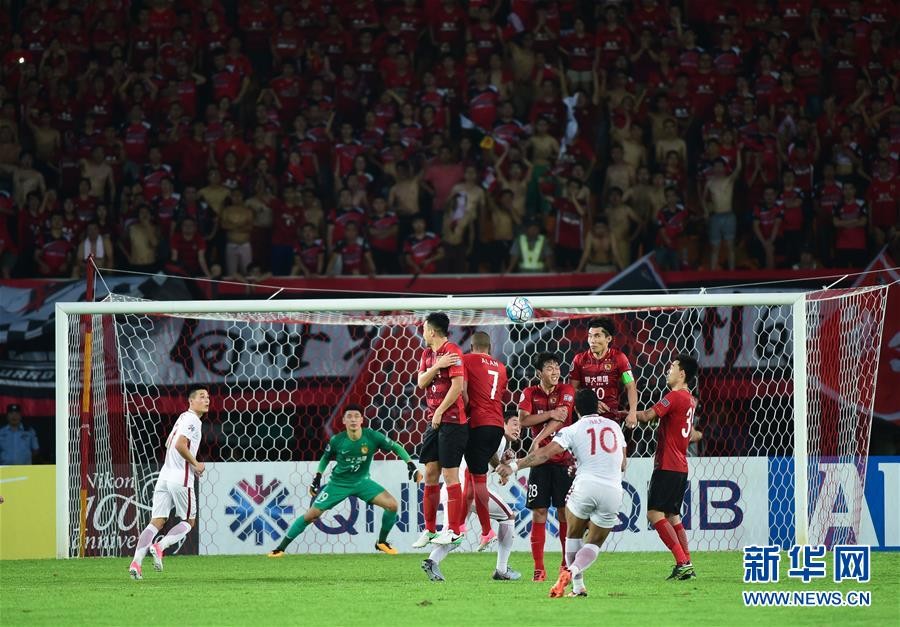 ↑9月12日,广州恒大淘宝队球员高拉特(右二)头球攻门。 新华社记者刘大伟摄