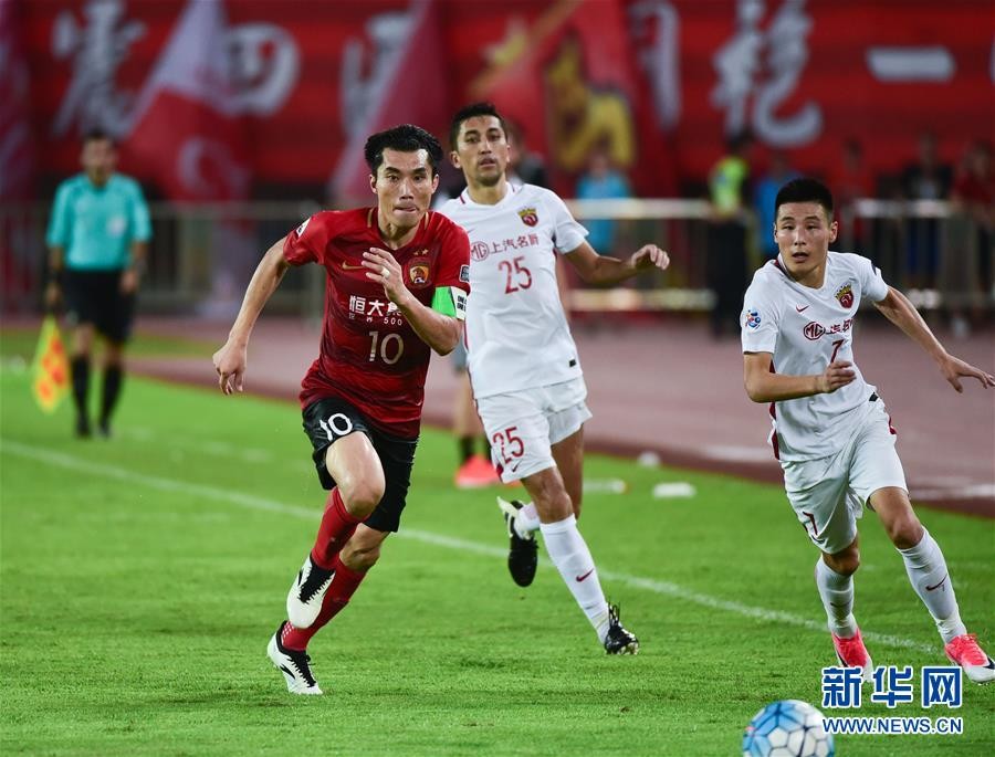 ↑9月12日,广州恒大淘宝队球员郑智(左一)与上海上港队球员武磊(右一)拼抢。 新华社记者刘大伟摄