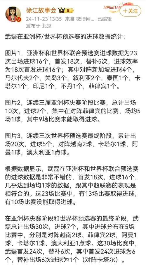 接下来就引发了部分媒体记者拿出的数据质疑,徐江的社媒置顶了武磊的国家队进去数据分析。意思就是武磊虽然国家队进球很多,都是弱队身上进球刷的数据,面对强队的数据差强人意。如果换其他人也许也能有那么多进球。对武磊能力质疑的人越来越多。