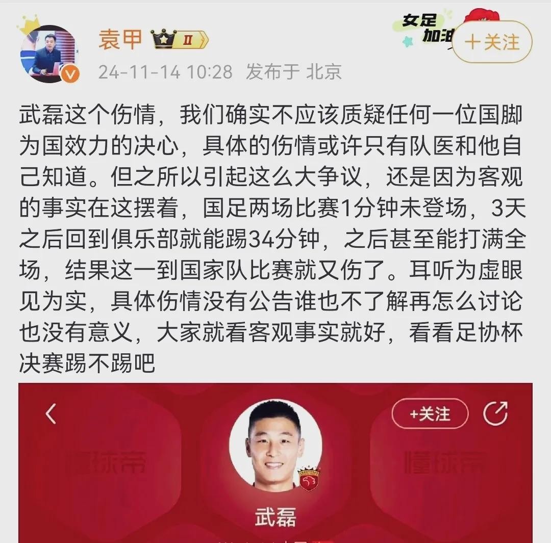 再比如伤病,完全可以放弃国家队报到,安心治疗康复,等联赛复出也合情合理。可是偏偏去报道了,还通过媒体的嘴巴表示很严重,无法代表国家队比赛,结果回俱乐部马上打满全场。结果没他的国家队比赛取得了大逆转,武磊再次成为争议人物,甚至被打上了不爱国、诈伤的标签。