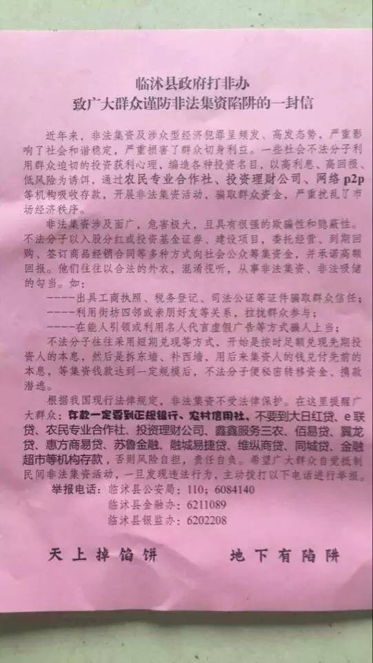 这几天网上疯传一份山东省临沂市临沭县政府打非办的《致广大群众谨防非法集资陷阱的一封信》(附于文末)。