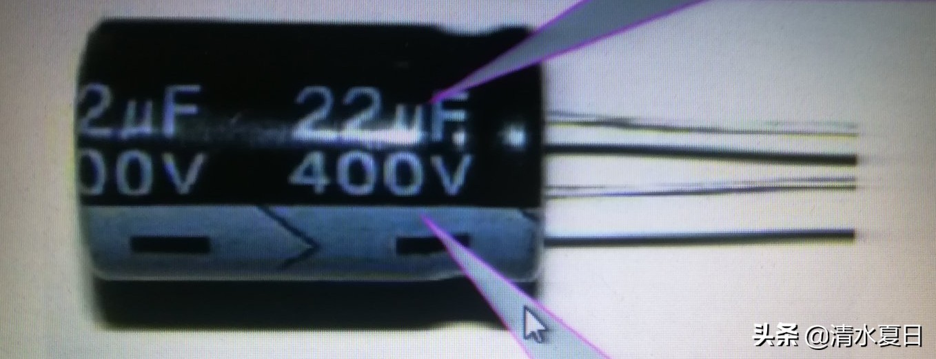 电解电容的参数读取,下图为耐压为400V,标称容值为22uf。也就是说加到上边的电压不能超过400V,否则会击穿。在安装时一定要分清极性。否则在上电时会有爆炸