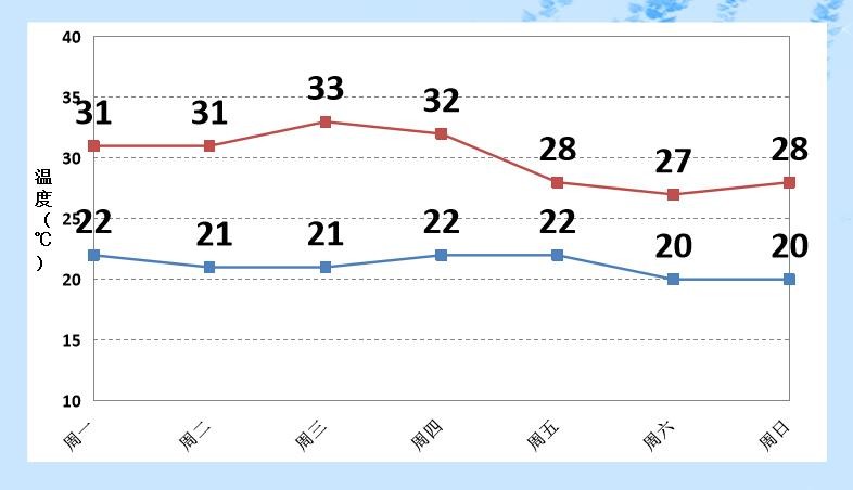 本周前期以晴为主,气温升高,体感闷热,夜间有轻雾。周后期云量增多,有一次降雨过程,气温下降。本周最高气温27~33℃ ,最低气温20~ 22℃。