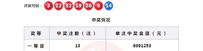 早起的鸟儿有虫吃,周二快乐!在最新一期的双色球开奖中,号码03、08、19、22、26、32+14出现,一等奖13注,二等奖253注,奖池累计至24.83亿元。本文将分析开奖情况,并探讨一些走势和预测。
