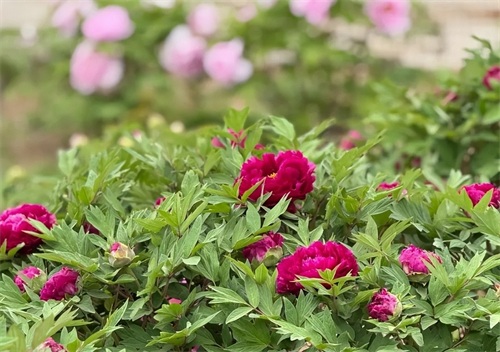 走进牡丹园,只见满园牡丹姹紫嫣红,美不胜收。红色似火、粉色如霞、白色胜雪、紫色若缎……各色牡丹竞相舒展芳姿。园内名贵品种“姚黄”“魏紫”“二乔”风姿绰约,复色牡丹“青龙卧墨池”更是以独特的绿蕊黑瓣成为镜头焦点。微风拂过,碗口大的花朵随风轻摇,如同盛装的“舞者”,在阳光下尽情地绽放。蜜蜂穿梭其间,引得游客驻足惊叹,纷纷用镜头定格这美好瞬间。
