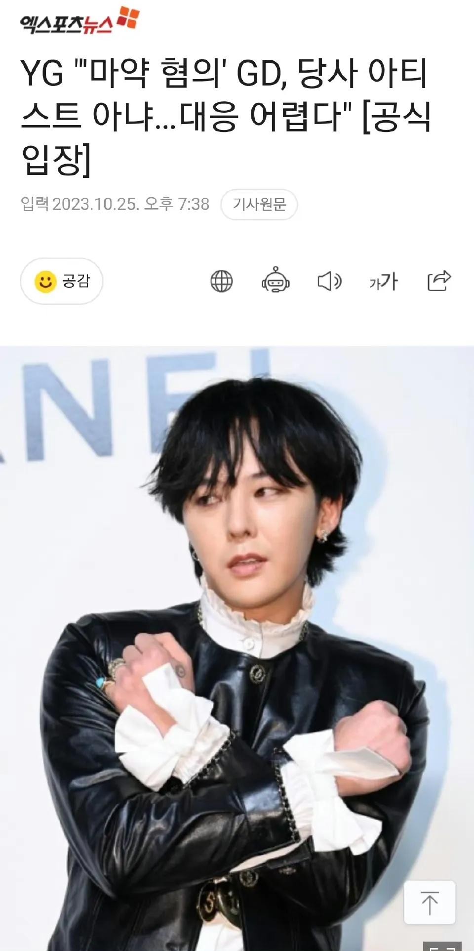对于GD的不拘留立案和毒品嫌疑,YG娱乐对Xports新闻表示:"现在不是本公司所属艺人,所以很难官方回应。"