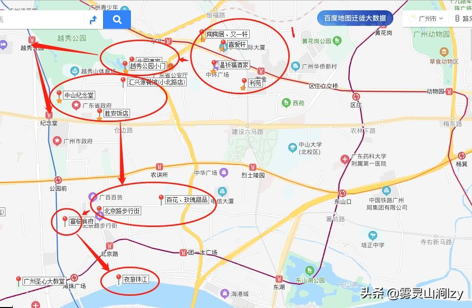 这个要差不多一天了,这里就不再细说了,放个地图吧台。或者可以玩下最近才开通的云道,起于越秀公园东北门的。线路大概为:中山纪念堂——越秀公园东北门——花果山公园——雕塑公园——麓湖公园——白云山,现在只到麓湖公园,白云山要以后才会打通,估计打通后会成为一个新的游览线路。