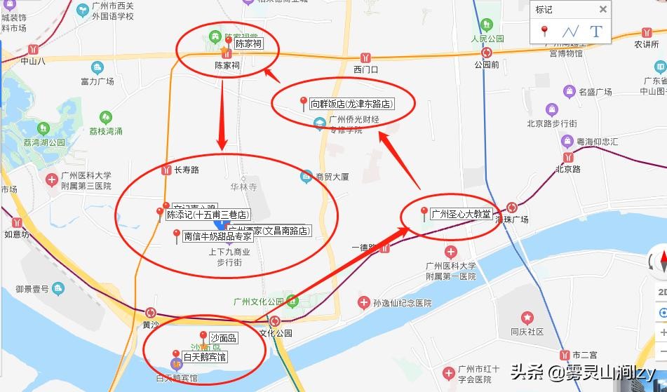 线路解析:早上在白天鹅喝个早茶,然后就在沙面这边游览下(建议2小时),游完10点多就出发去圣心大教堂(建议1小时)。到了中午饭点时间就去龙津西路的向群饭店,吃下老字号地道的粤菜,吃完消化完就可以去陈家祠转转了(建议1小时)。游览完陈家祠就去上下九步行街(建议3小时),这里小吃、甜品很多,如果你吃的下可以下午吃个甜品,比如南信、仁信,小吃就吃个鱼皮陈添记等。结束游览完后想吃晚饭这里可以推荐文记一心鸡、广州酒家、友联菜馆、永兴烧腊等,这里我就简单的上传个我在地图上标的路线图给大家看下吧!