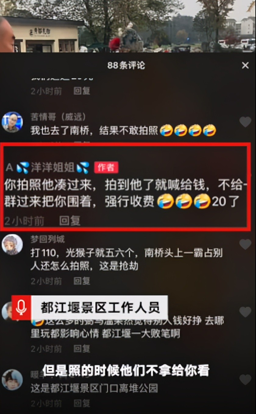 11月9日,有网友在短视频平台上传视频举报都江堰景区门外,有卡通人偶抢镜合影强行收费。因人偶不会事先说明合影需支付费用,有游客留言直呼上当。景区工作人员告诉记者,卡通人偶不是景区人员装扮的,当卡通人偶进入景区范围时,工作人员会进行驱逐。社区工作人员称,类似强买强卖的情况,上级相关部门处理过,但是现在又反复了,只能再向街道办进行反映。