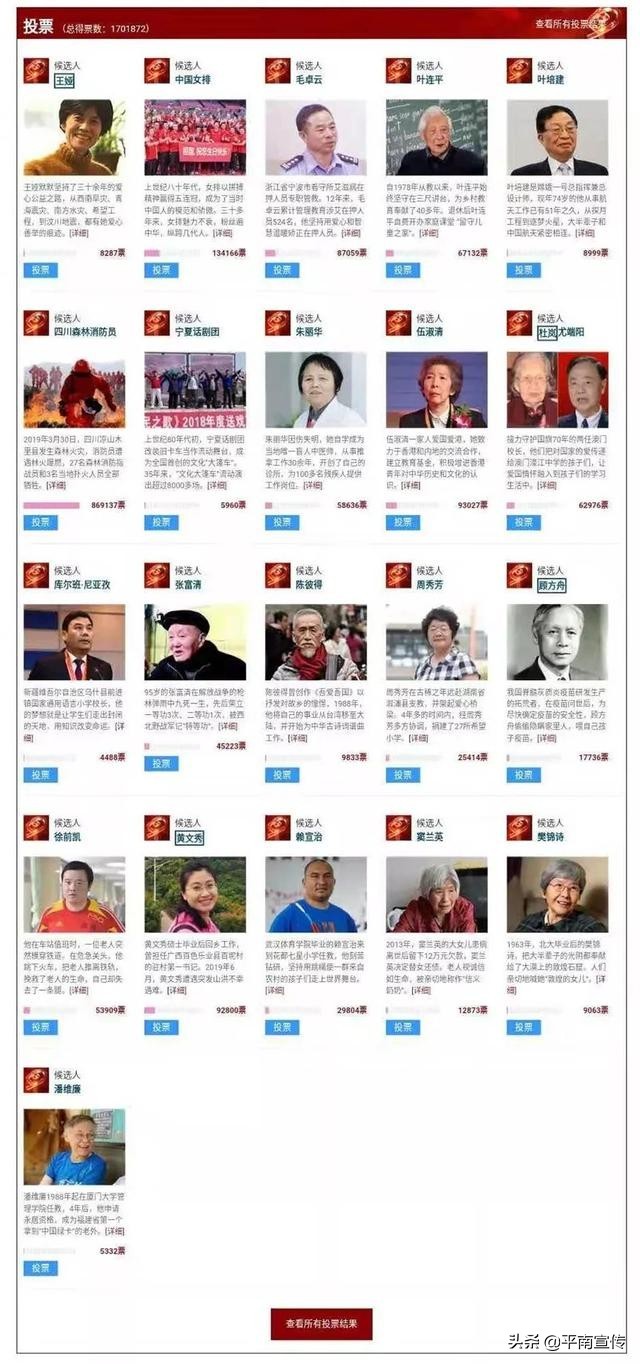 央视网日前公布了感动中国2019年度候选人物名单,并于2019年11月20日起接受公众投票。