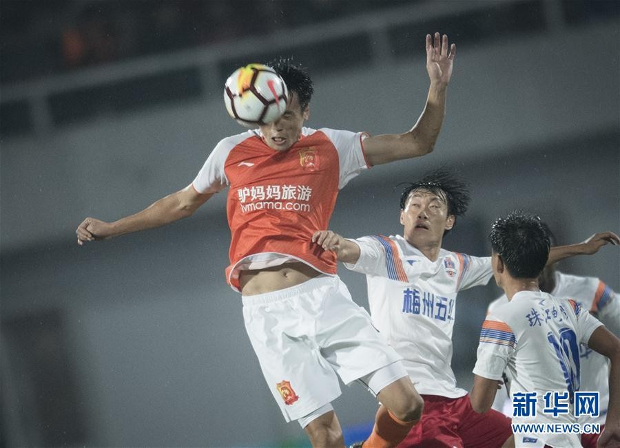 ↑10月20日,武汉卓尔队球员艾志波(左一)与梅州客家球员王攀(左二)在比赛中争顶。 当日,在2018赛季中甲联赛第28轮比赛中,武汉卓尔队主场对阵梅州客家队。 新华社记者肖艺九摄